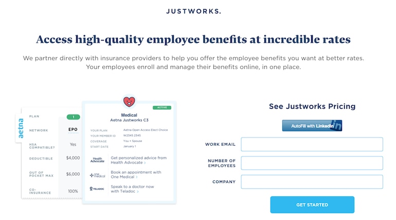 El botón de CTA azul de Justwork también contrasta con el fondo de la página y se relaciona con la jerarquía visual de la página: