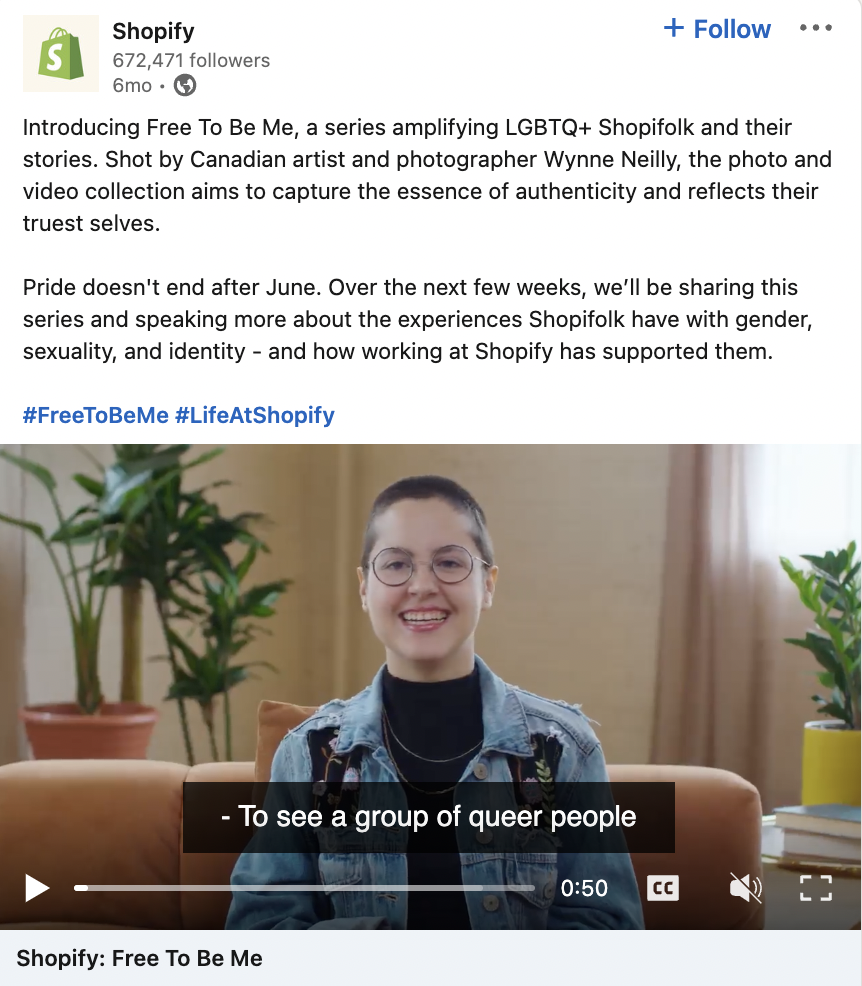 Para Shopify, el trabajo tiene sus raíces en la diversidad global y la pertenencia. Su iniciativa de crear y apoyar un entorno diverso e inclusivo es un proceso intencional que se resume en su serie Free To Be Me que centra las experiencias de LGBTQIA+ Shopifolk.