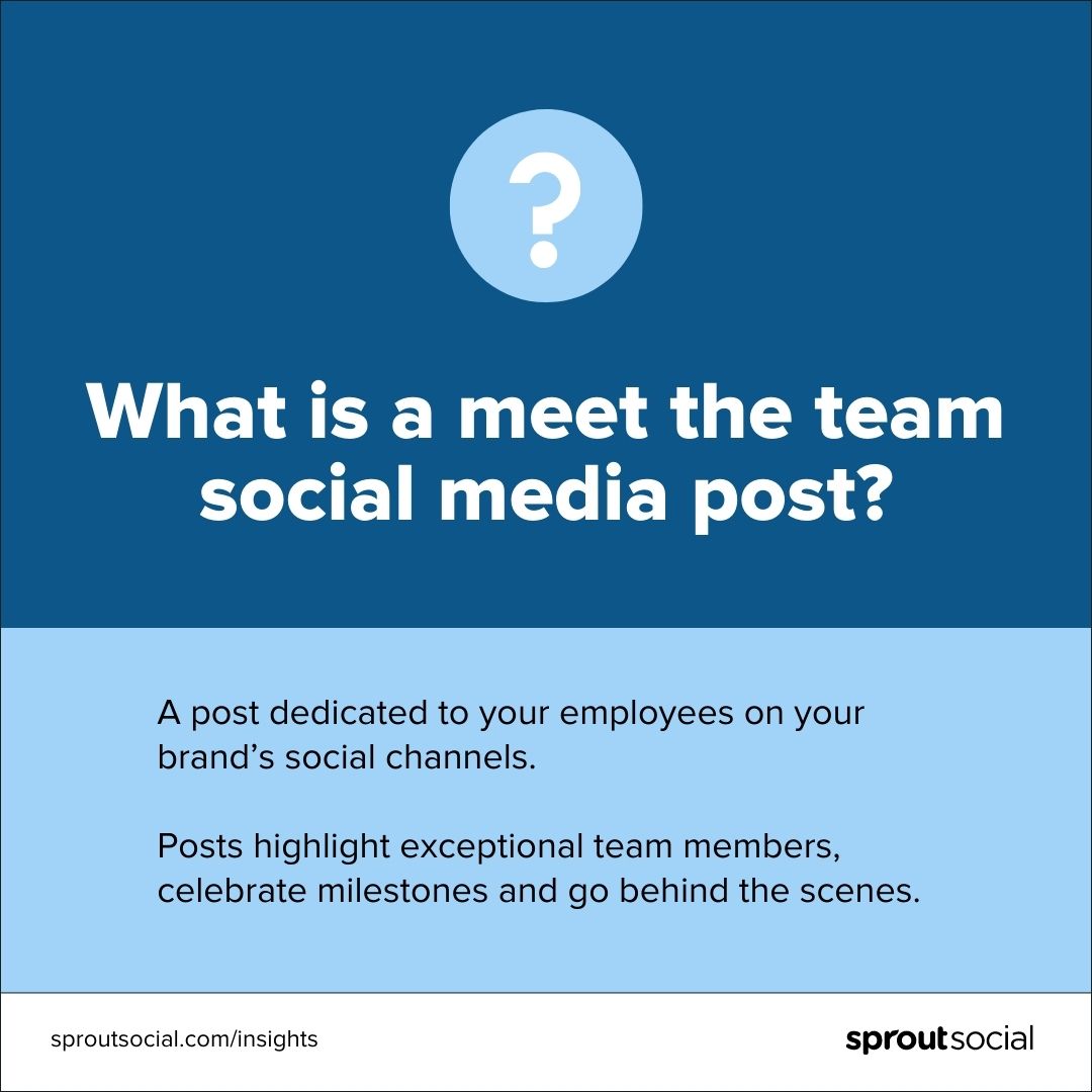 Conozca al equipo Las publicaciones en las redes sociales describen el contenido publicado en los canales sociales de su marca dedicados a sus empleados. Conozca al equipo Los ejemplos de publicaciones en redes sociales incluyen: