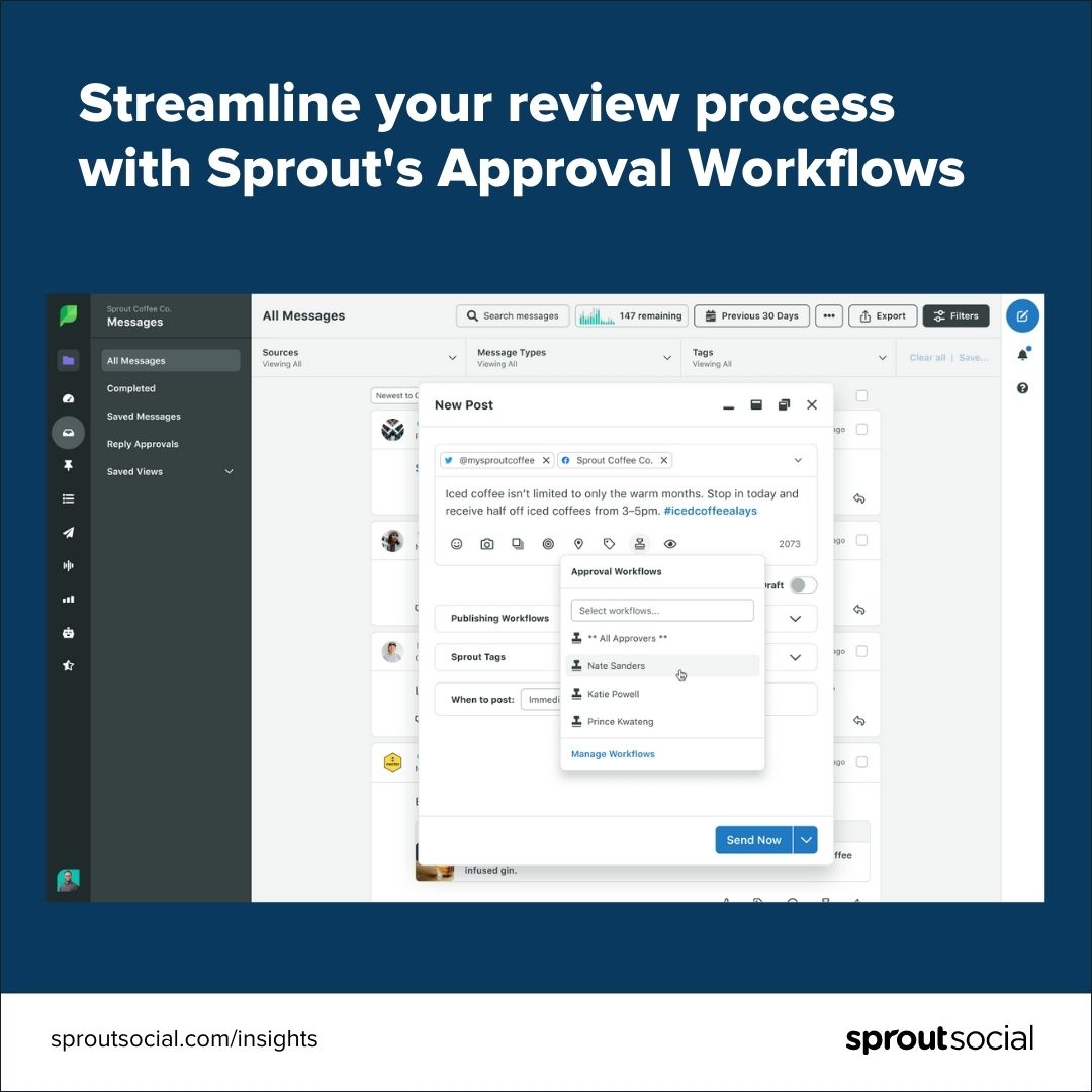 Consejo profesional: si está trabajando en equipos para aprobar y programar contenido, los flujos de trabajo de aprobación de mensajes de Sprout pueden ayudarlo a organizar quién es responsable de cada paso del proceso de revisión y programación.