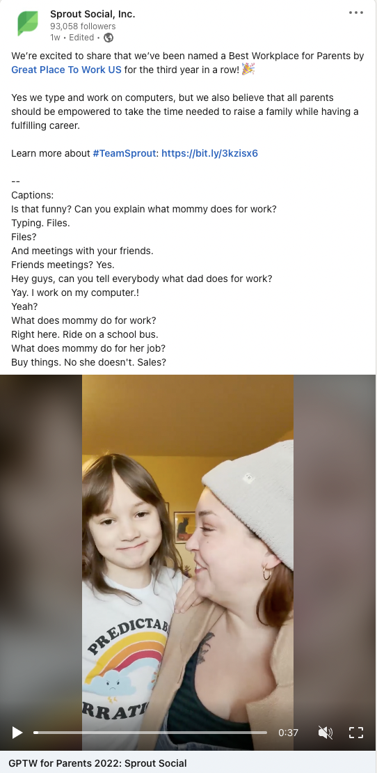 Por qué funciona: las experiencias de los empleados son los ejemplos más confiables de la cultura, la misión y los valores de una empresa. Los defensores de la marca desempeñan un papel fundamental a la hora de impulsar la notoriedad de la marca, potenciar los esfuerzos de contratación y generar clientes potenciales.