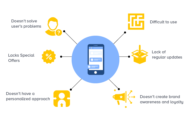 La razón subyacente por la que la mayoría de los usuarios abandonan una aplicación de marca es una experiencia de usuario deficiente o se centra más en el valor de la novedad y carece de funcionalidad. Entonces, aquí hay algunos errores comunes que debe evitar al crear una aplicación y establecerla como un canal de marketing de marca efectivo.