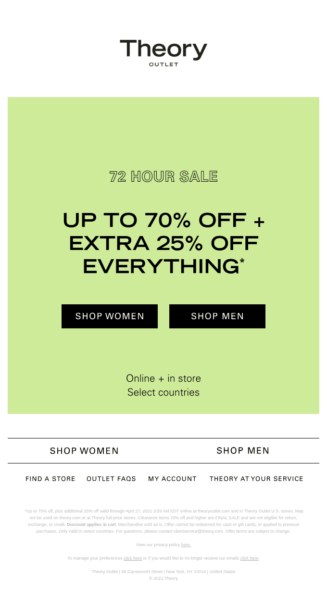 Para sus ideas de boletines informativos que contengan ventas, asegúrese de proporcionar la información más importante en la parte superior, incluido cuánto tiempo tienen sus clientes para aprovechar una venta. Comenzar su boletín con el marco de tiempo real, como la "oferta de 72 horas" en esta plantilla y completar los detalles más tarde, a menudo es suficiente para impulsar el tráfico de su sitio web a un ritmo más alto.