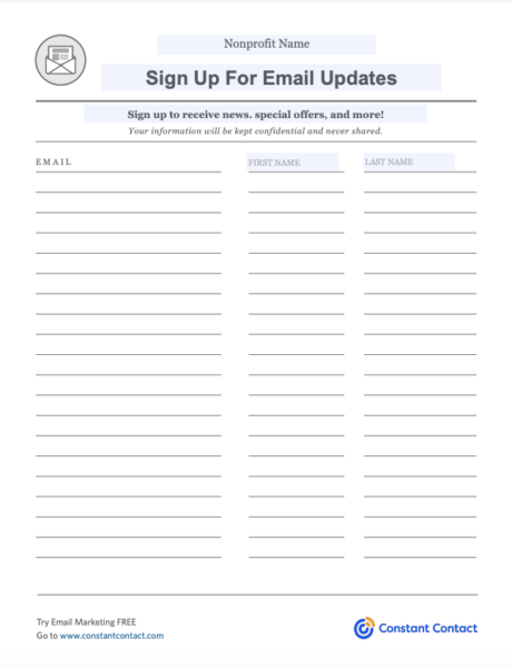 Los asistentes, simpatizantes y donantes pueden optar por participar y registrarse en su lista de correo electrónico cuando llegan a un evento. Tener una hoja de registro de correo electrónico física en el evento es otra excelente manera de brindarles a los asistentes la oportunidad de registrarse para recibir los correos electrónicos de su organización sin fines de lucro.