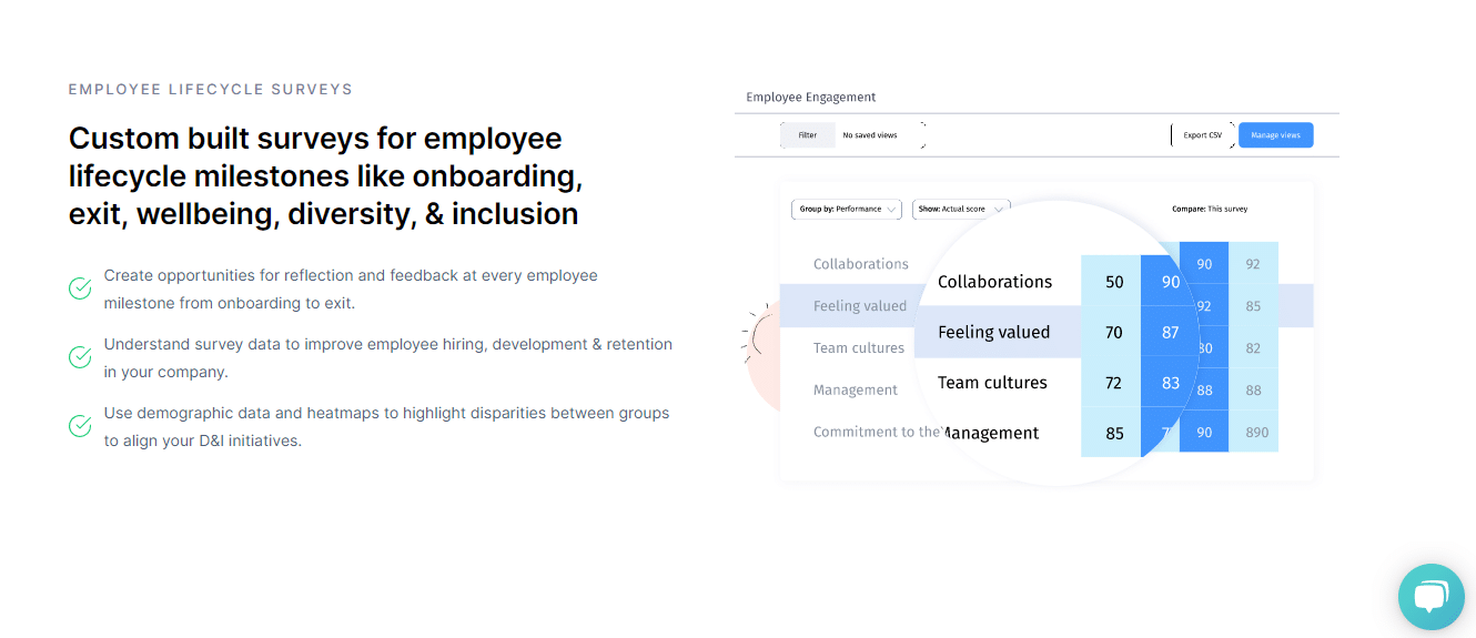 Y eso es lo primero con lo que ayudamos a nuestros clientes. Los ayudamos a identificar los diversos impulsores que involucran o desmotivan a sus empleados a través de nuestras encuestas de pulso y encuestas de compromiso.