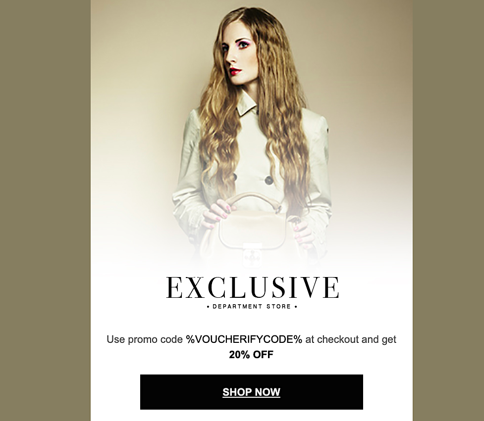 Un mensaje de correo electrónico de ejemplo creado en ActiveCampaign que contiene un fragmento de código de Voucherify.