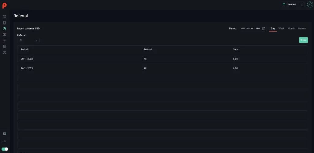 Al iniciar sesión, se mostrará la página principal de su cuenta personal de PIN-UP Partners. Esta página proporciona estadísticas de las últimas 24 horas.
