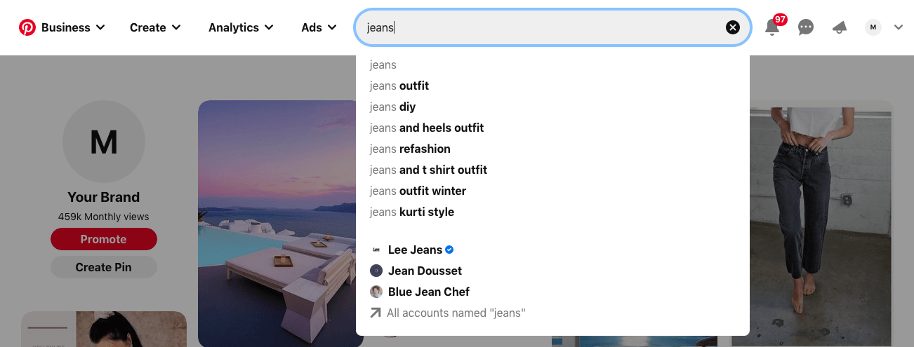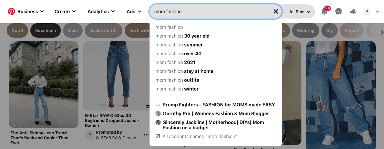 - Usa la barra de búsqueda. Como acabamos de mencionar, Pinterest sugiere temas populares relacionados con la palabra clave que ingresó. Aquí hay un ejemplo, donde buscamos "Jeans" y Pinterest nos muestra algunos de los modificadores más comunes que las personas agregan a la palabra "jeans" cuando buscan en Pinterest.