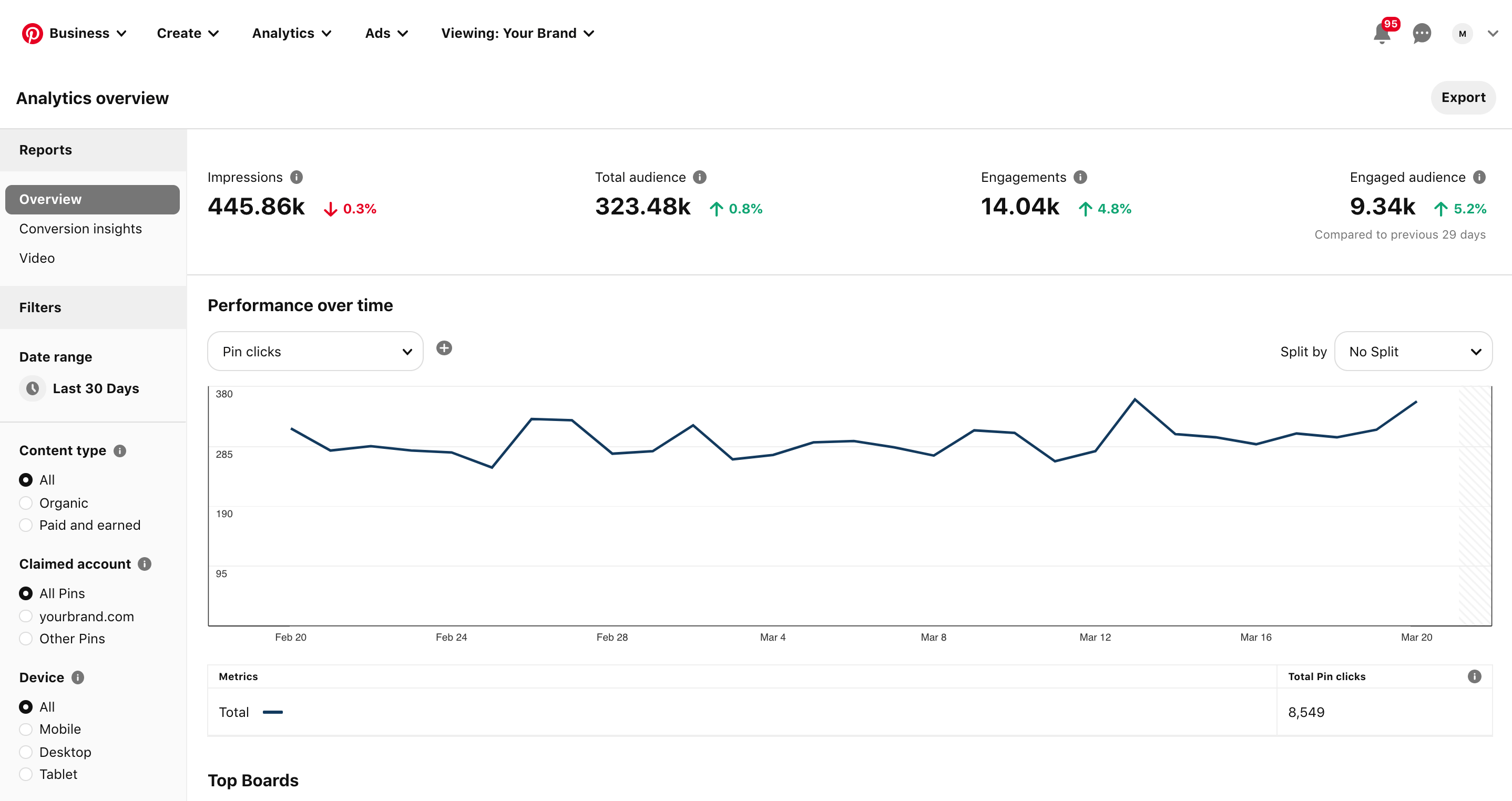 - Verifique qué tipos de contenido resuenan más con su público objetivo, según los pines y tableros recomendados .