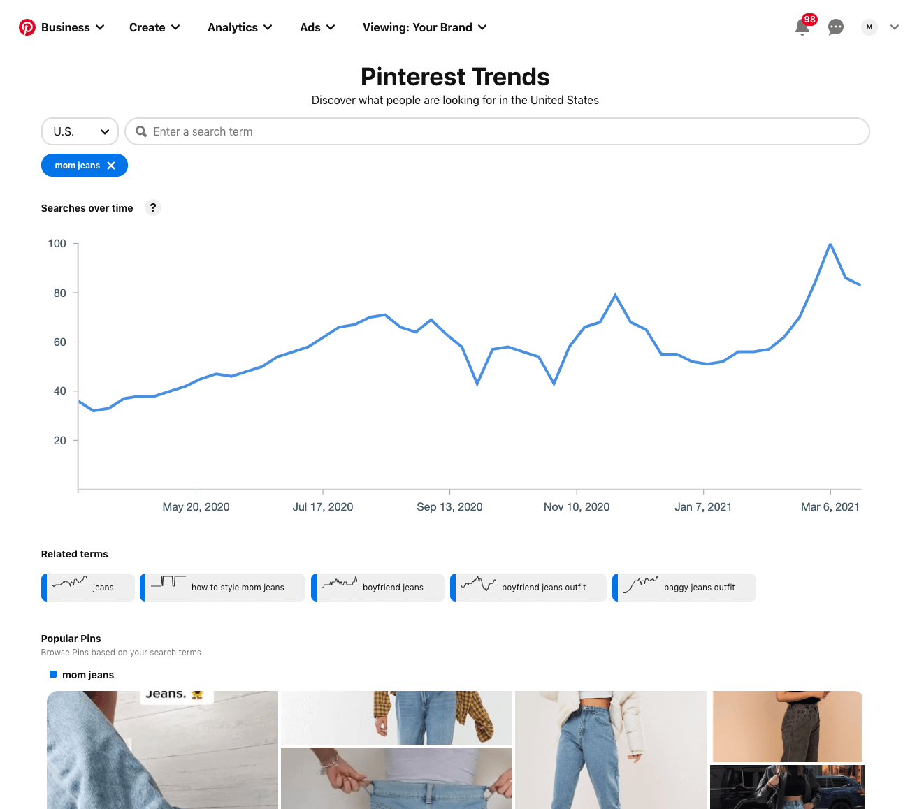 - Use Pinterest Trends , que puede ayudarlo a adaptar las palabras que usa para que coincidan con los términos exactos que las personas realmente buscan en Pinterest. Por ejemplo, puedo ver que los "Mom Jeans" son tendencia en este momento. Y su tendencia de búsqueda a lo largo del tiempo está indexada entre 0 (sin interés relativo) y 100 (interés máximo):