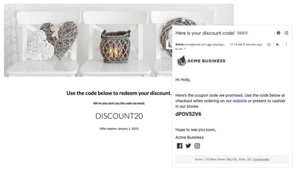 Una forma de hacerlo es enviando a los clientes actuales un código de cupón exclusivo. Puede optar por enviar esto a contactos fríos que no han comprado en un tiempo o usarlo como una herramienta para recompensar a los clientes leales. De cualquier manera, es una forma inteligente de volver a involucrar y crear nuevas oportunidades de compra para los clientes.