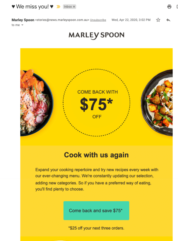 Este correo electrónico de Marley Spoon ilustra cómo los cupones se pueden usar como una forma de volver a atraer a los clientes fríos: