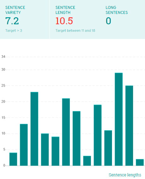 Entonces, con base en este informe, puede realizar modificaciones en el área donde se debe agregar más variedad. El uso de muchas oraciones largas puede generar un texto monótono . Por otro lado, cuando se usan demasiadas oraciones cortas, el texto se ve entrecortado. Por lo tanto, en un escrito refinado, se debe utilizar una combinación adecuada de oraciones cortas, medianas y largas.