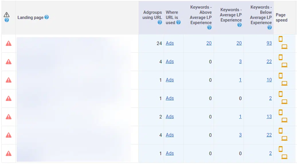 Esta captura de pantalla de Adalysis muestra varias páginas de destino con experiencias de página de destino por debajo del promedio.