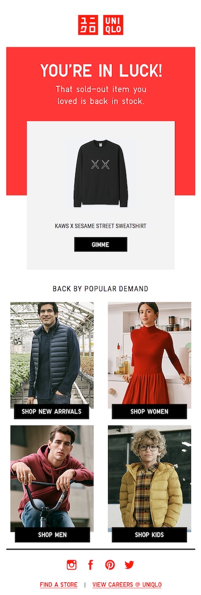 Uniqlo coloca el artículo reabastecido en la parte superior de la alerta de reabastecimiento con una divertida llamada a la acción "dame". Debajo de la CTA principal hay opciones para buscar otros artículos recién reabastecidos por categoría si al suscriptor ya no le importa la pieza inicial.