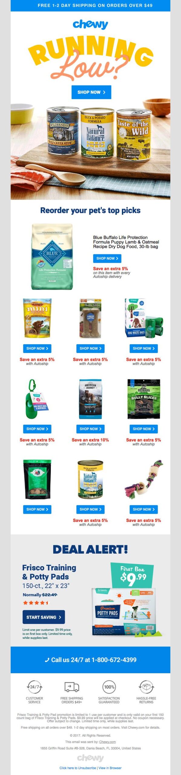 Si la automatización del correo electrónico de Chewy nota que ha pasado más tiempo de lo habitual entre los pedidos de un cliente, envían un mensaje de recuperación. ¿El casual "se está agotando?" El recordatorio puede ser un recordatorio de bienvenida para los ocupados dueños de mascotas que han tenido la intención de hacer un pedido. El correo electrónico incluso incluye la misma comida que normalmente compra una cuenta.
