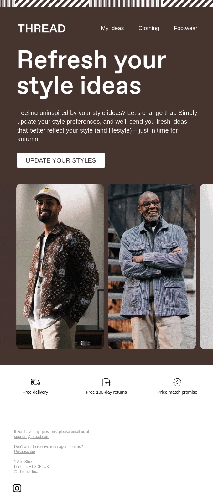 Thread reconoce que sus suscriptores son dinámicos, por lo que utilizan un mensaje de reenganche para actualizar sus preferencias. Si cree que una persona se ha desviado porque sus gustos o necesidades han cambiado, darles voz sobre el contenido y los productos que ven puede ayudar a impulsar el compromiso.