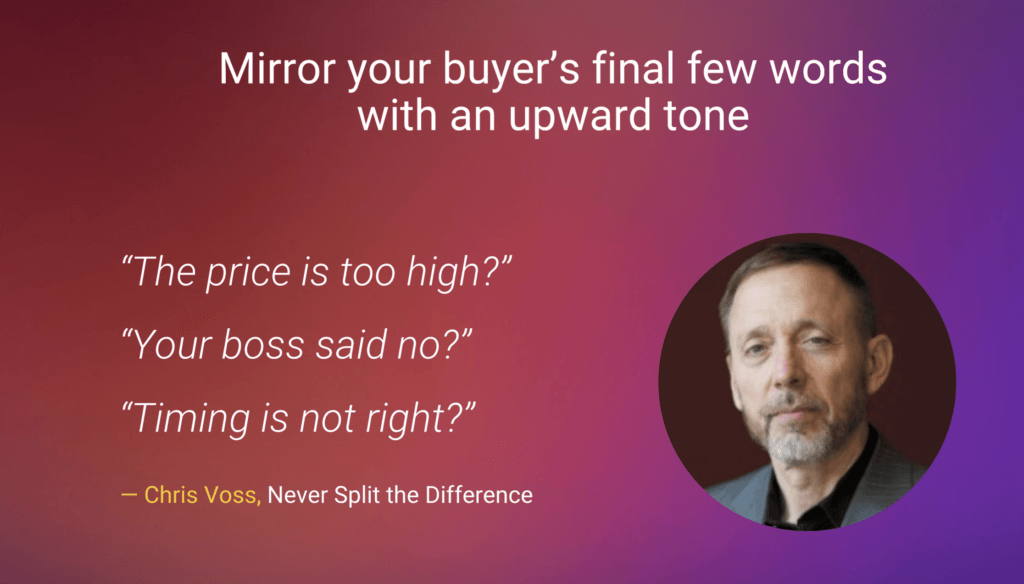 - Intenta duplicar. Chris Voss habla sobre esta técnica de manejo de objeciones en su libro Never Split the Difference . Esto es lo que debe hacer: repita las últimas palabras de la oración de su comprador. Y hazlo con un tono de voz ascendente (como si estuvieras haciendo una pregunta). Activa a su comprador para elaborar.