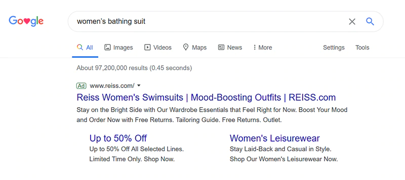 Este es un ejemplo de una campaña de búsqueda sin marca que se orienta a la palabra clave general "traje de baño de mujer":