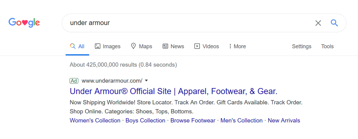 Este es un ejemplo de un anuncio de búsqueda de marca: Under Armour (la marca) puja por “under armour” (la palabra clave).