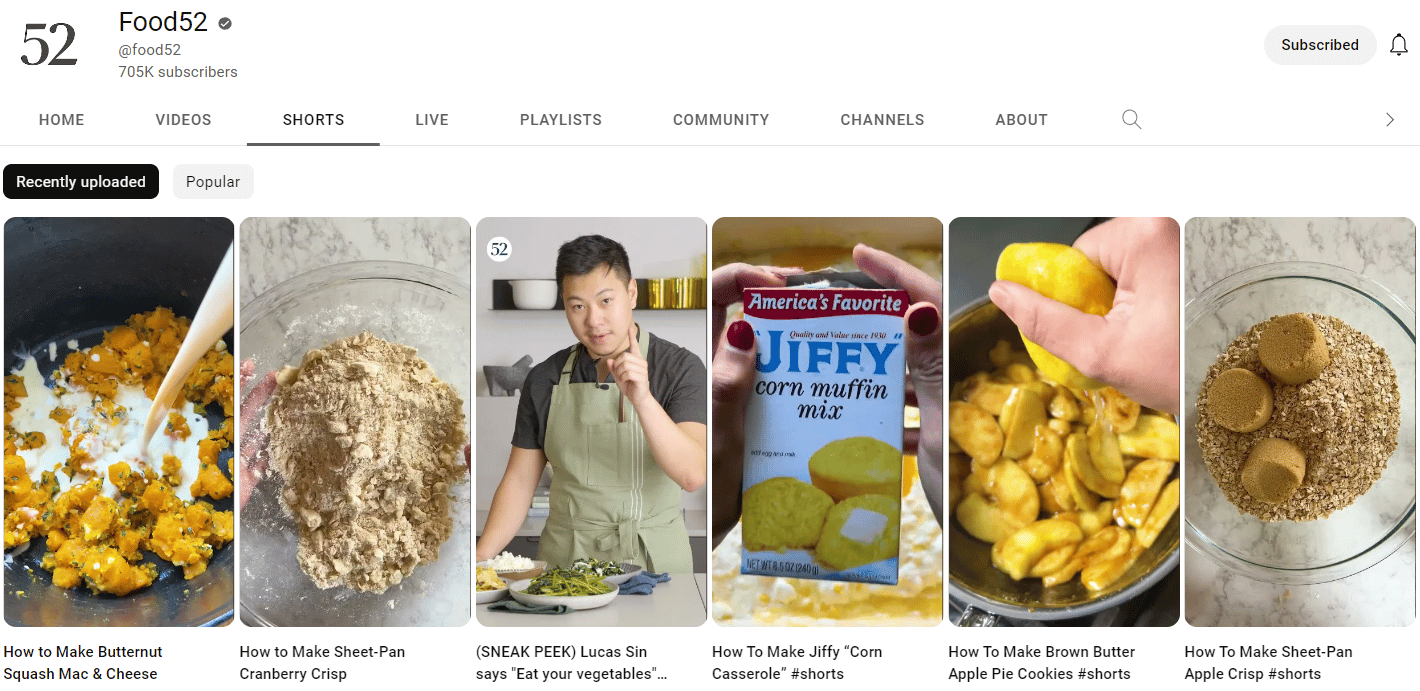 Food52 usa YouTube Shorts para mostrar recetas rápidas y consejos de cocina. También publican cortos que presentan vistas previas de su contenido de video más largo.