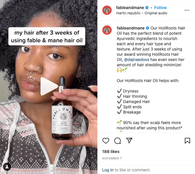 Por ejemplo, sabiendo que UGC es uno de los tipos de prueba social más convincentes, puede volver a publicar contenido de sus seguidores que mencione su marca o productos. Esto es lo que hace la marca de cuidado del cabello Fable & Mane en Instagram con gran éxito.