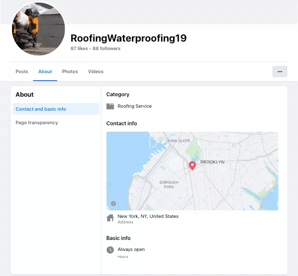 Por otro lado, si revisa un perfil de Facebook de una empresa como RoofingWaterproofing19, verá cuán grande puede ser un error omitir información. Esta empresa no tiene una dirección, un sitio web ni un número de teléfono. Y lo que es más, su falta de actividad sugiere que ya no está activa, lo que hace que sea mucho menos probable que la página de Facebook atraiga clientes potenciales para la empresa.