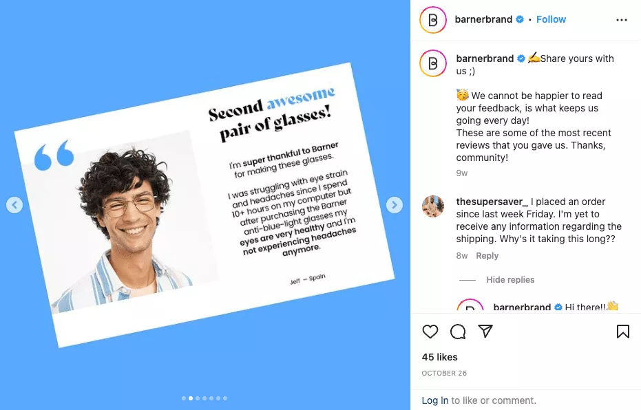 O bien, puede elegir un enfoque más directo y convertir las reseñas de los usuarios en publicaciones en las redes sociales. Si revisa la página de Instagram de Barner, verá que esto es lo que hace esta marca para convencer a los seguidores de que prueben sus productos.