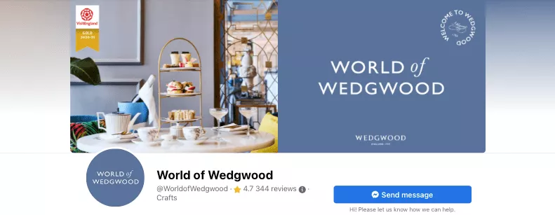 Por último, no se olvide de mostrar las calificaciones de estrellas en su página de Facebook. Si revisa el perfil de World of Wedgewood, notará instantáneamente la impresionante calificación de 4.7 estrellas, que tiene un tremendo potencial para ayudar a la marca a atraer y convertir nuevos clientes.
