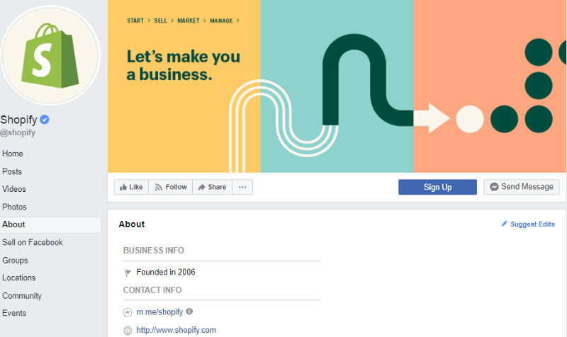 Puede usar Facebook y crear una página de fans de negocios para promocionar su negocio. Aquí hay un ejemplo de la página de negocios de Facebook de Shopify.