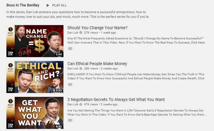 Puede usar YouTube para responder a sus clientes potenciales y las preguntas de los clientes existentes a medida que interactúa con ellos. Aquí hay un ejemplo del canal de youtube de Dan Lok.
