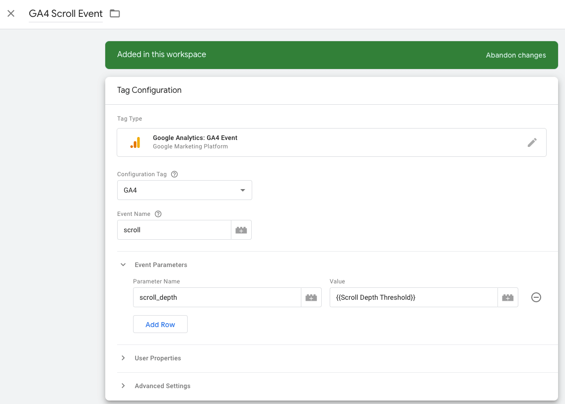 - Paso 4: Usaremos "scroll_ depth" para el nombre del parámetro. A continuación, el valor será {{Umbral de profundidad de desplazamiento}}, una variable dentro de GTM que obtendrá los porcentajes de desplazamiento a medida que las personas interactúan con la página y los datos se envían de vuelta.