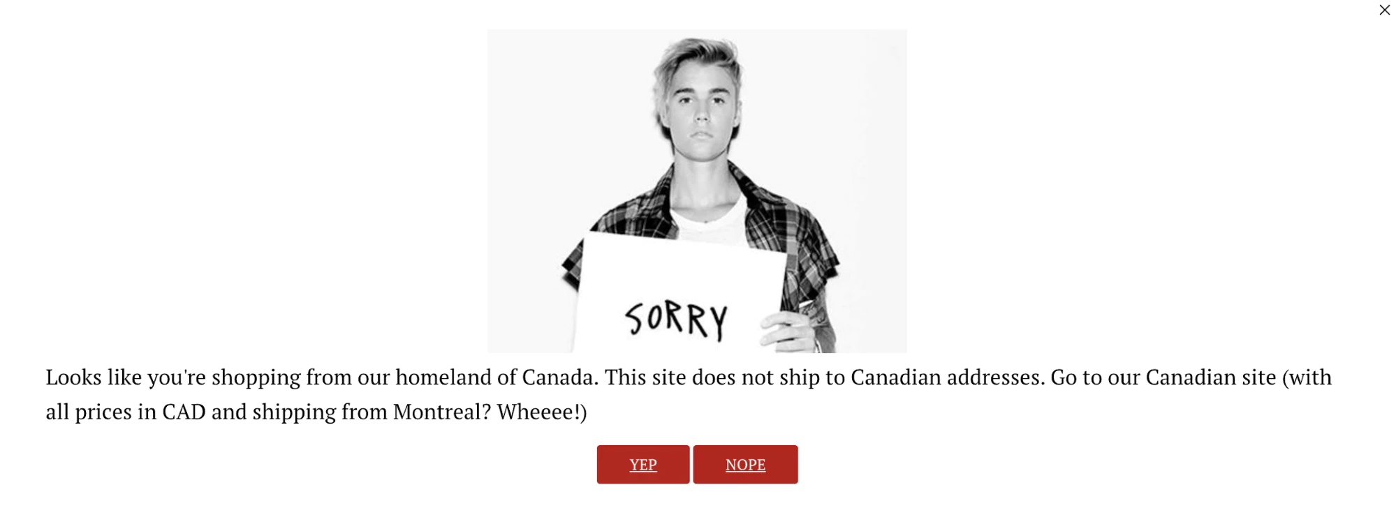 Por ejemplo, cuando visite el sitio de Stay Home Club desde Canadá, verá esta ventana emergente de Justin Bieber con un cartel bastante canadiense: