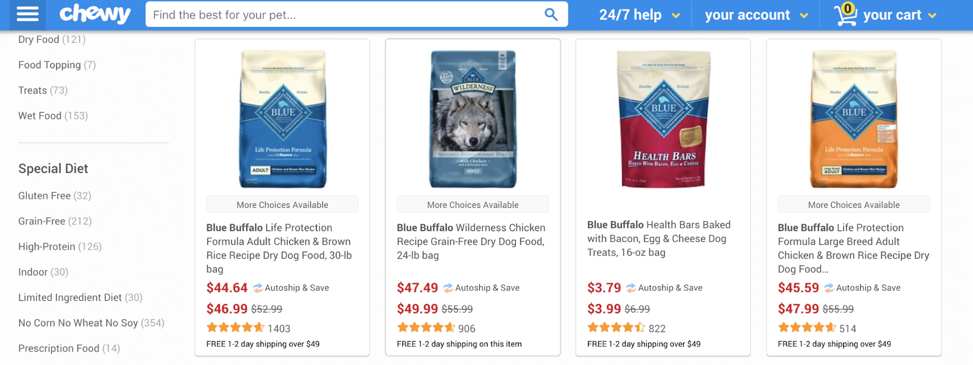 Chewy rara vez enumera precios de números redondos, prefiriendo terminar con $ 0,99 en su lugar. Tienen un programa de envío automático en el que los clientes pueden obtener un descuento aún mayor al comprometerse con la compra más de una vez. Los precios de envío automático son aún menos redondos.