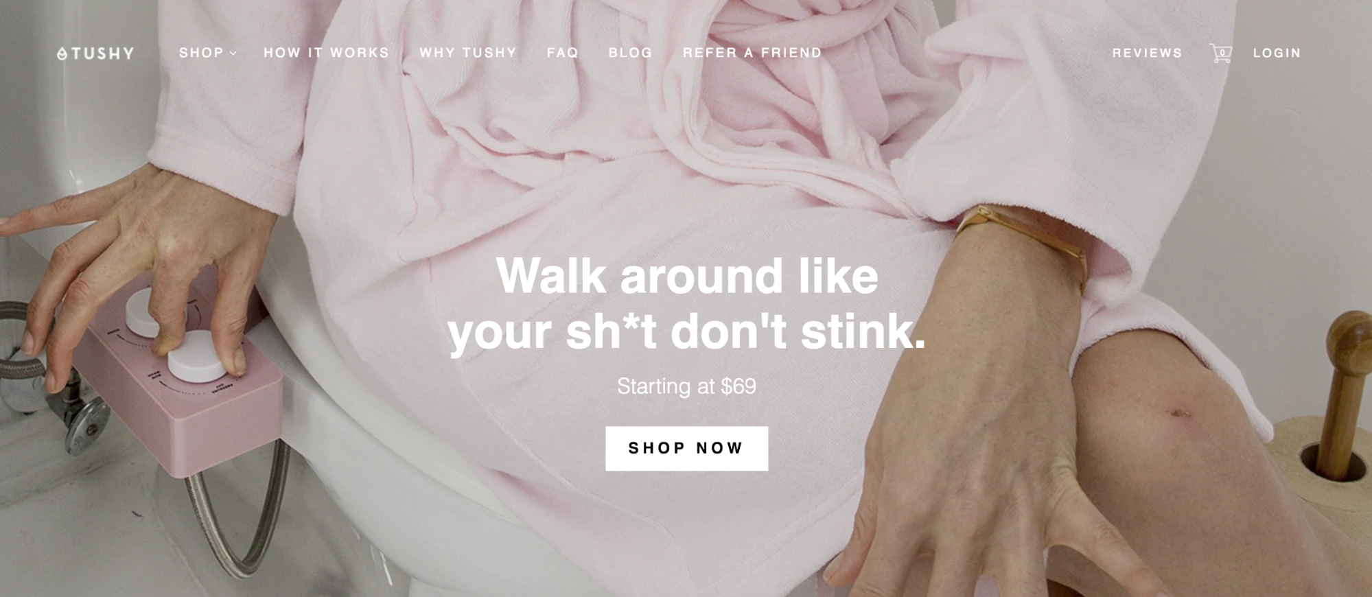 TUSHY lo hace bien en su página de inicio, en sus páginas de productos y en su marketing: