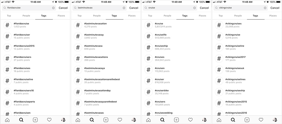 Ahora, digamos que es dueño de una agencia de viajes llamada “Sea Life Travel” y se especializa en reservar cruceros. Construiría una lista de hashtags que se parece a esto: