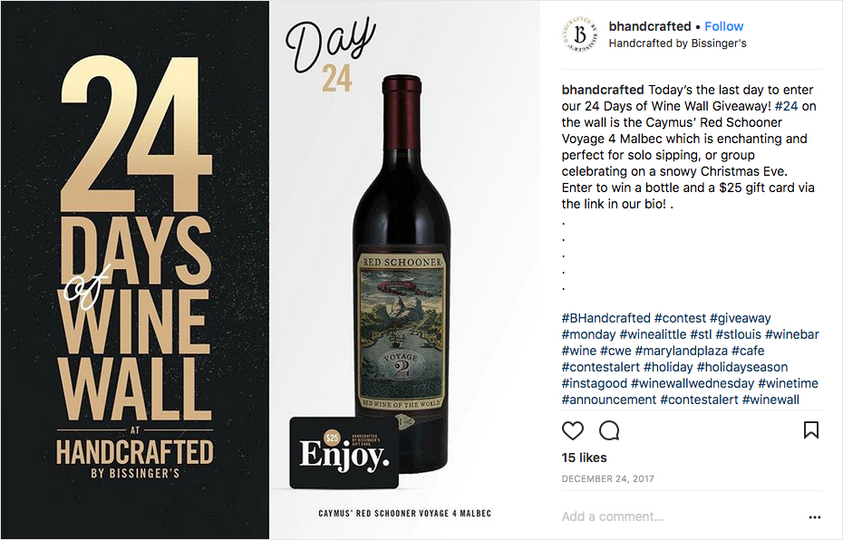 Muchas marcas usan hashtags al azar, por lo que cuando alguien lo hace bien, se destaca. En este ejemplo, BHandcrafted, un bar de vinos y café en St. Louis, Missouri, usa una combinación de hashtags populares (#contest) con un par de hashtags locales (#stlouis) y los suyos propios (#bhandcrafted) que alientan a sus clientes usar.