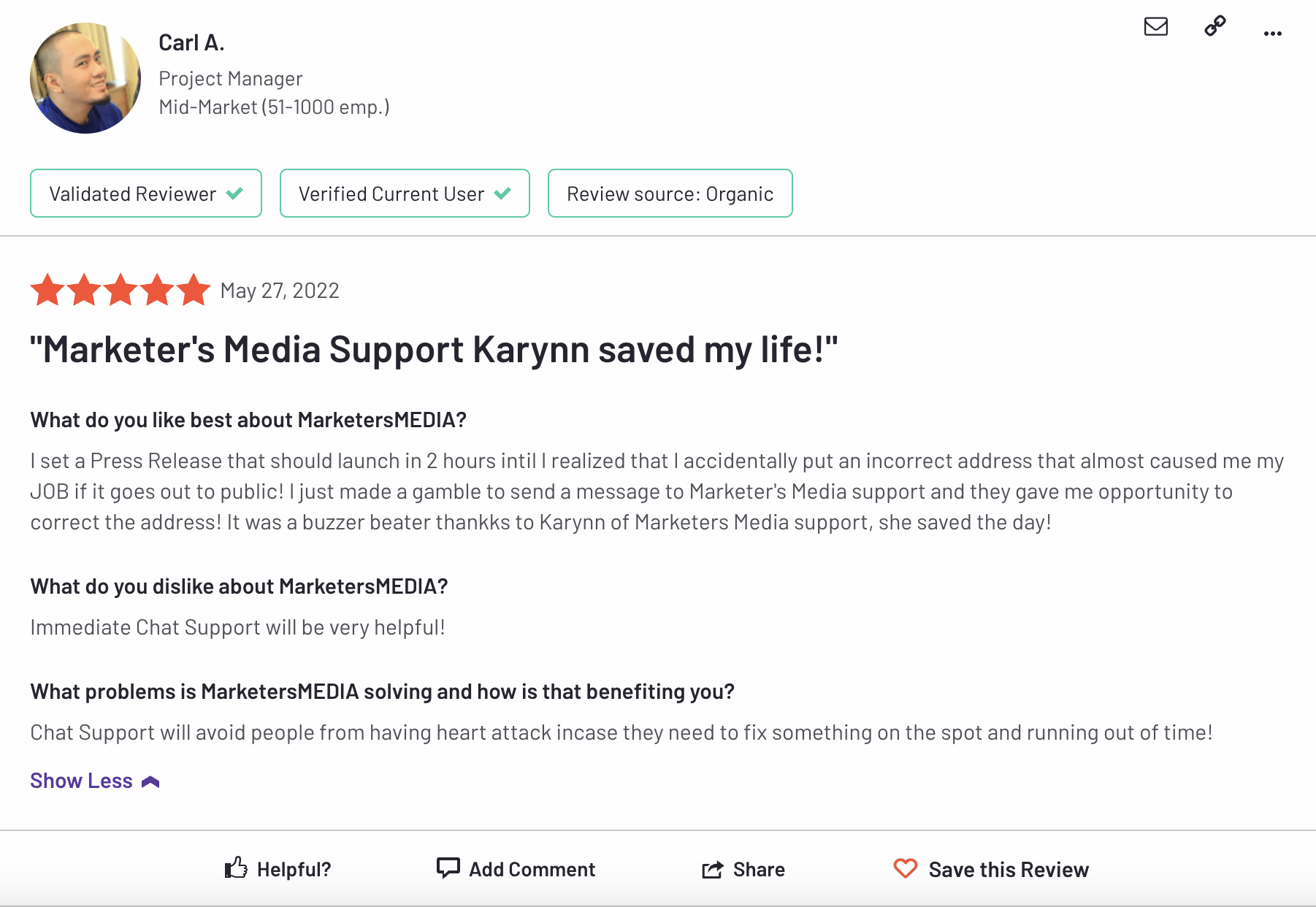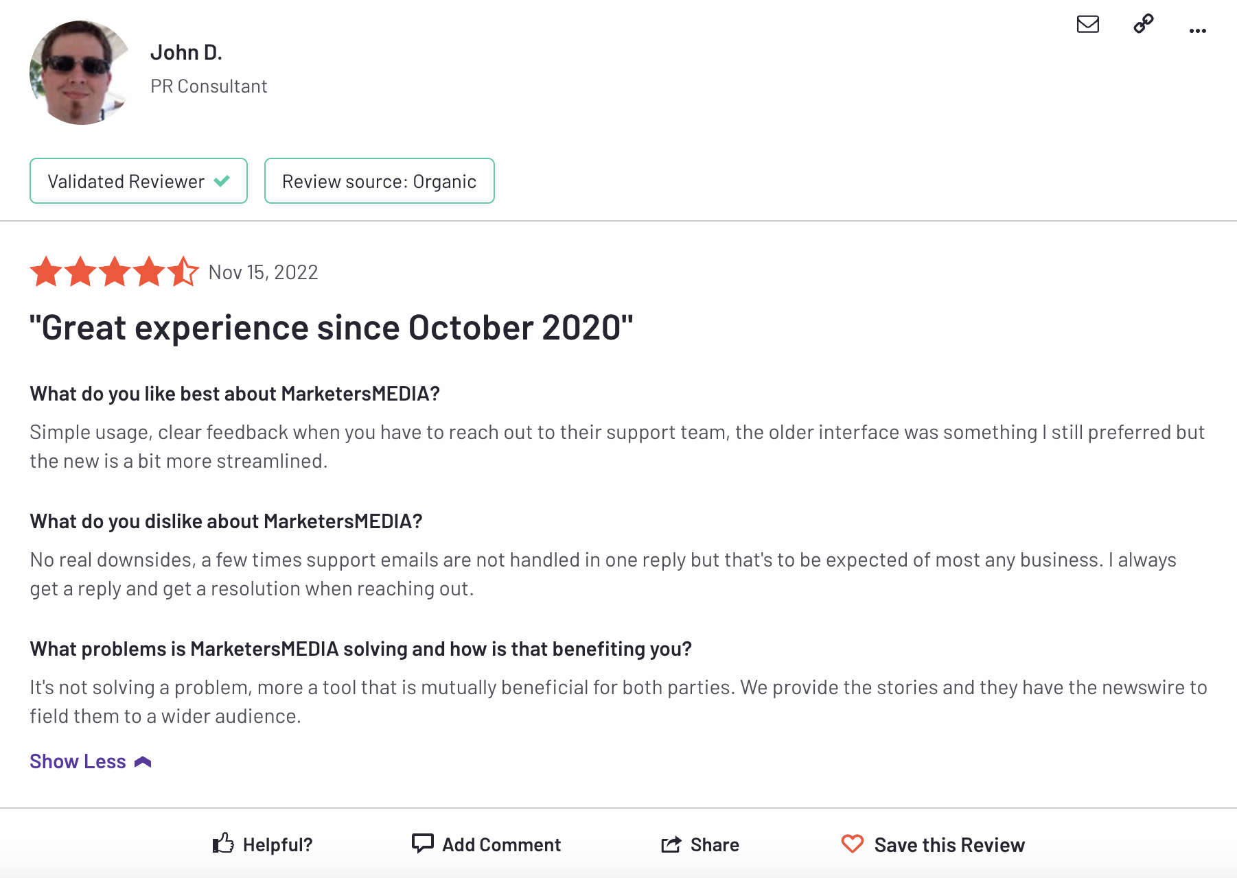 Una reseña de un usuario de MarketersMEDIA Newswire