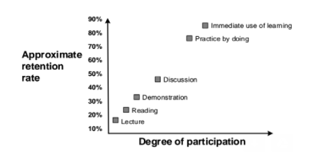 El gráfico de arriba es de otro estudio reciente que comparó los tipos de aprendizaje y cómo se correlacionaron con las tasas de retención. Historia final: cuanto mayor sea el grado de participación, mayor será la tasa de retención. Adiós a las conferencias y lecturas (mientras escribo un artículo que espero que lean y retengan la información), y hola a los grupos de discusión y práctica.