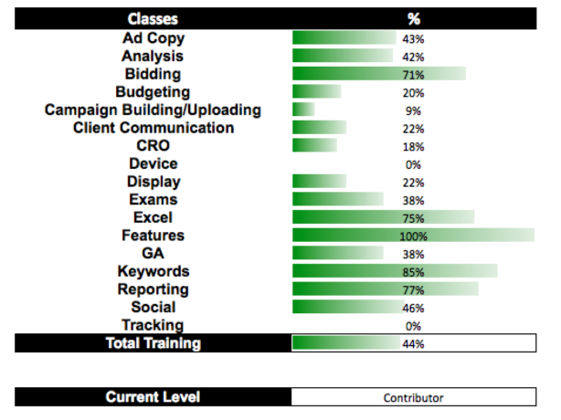 A partir de ahí, ¿qué nos dice el sentido común que hagamos? Utilice estos métodos para asegurar la motivación de los empleados durante el proceso de formación. Cree puntos de control, listas de tareas pendientes y niveles en su programa de capacitación que los empleados puedan controlar ellos mismos. Crear gráficos que muestren qué porcentaje de cada nivel se completa a medida que los empleados pasan por su capacitación es extremadamente importante para crear motivación. La siguiente tabla es un ejemplo: