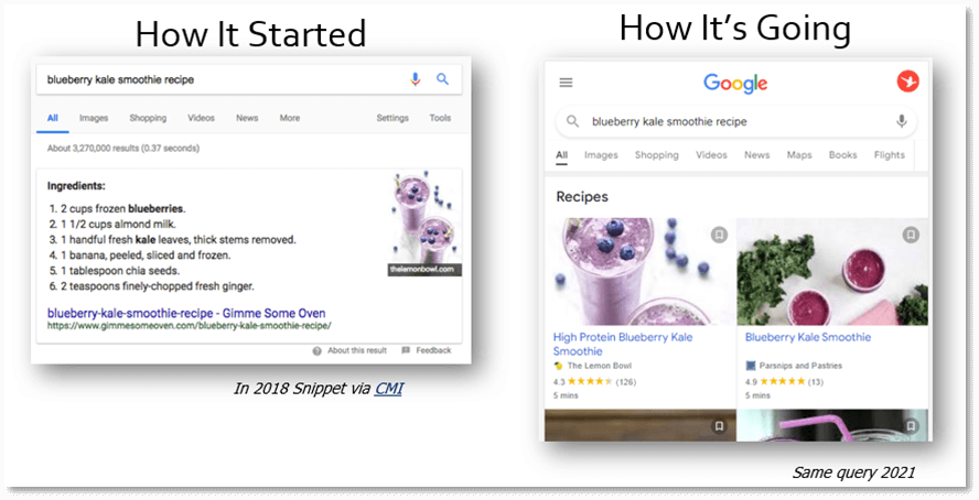 Los resultados de la búsqueda cambian todo el tiempo, no solo el orden de los resultados, sino también las funciones y la interfaz de usuario. A lo largo de los años, hemos visto cómo los enlaces azules se reemplazan por fragmentos destacados, luego los fragmentos destacados se volvieron menos prominentes a medida que proliferaban los paneles de conocimiento, y así continúa el ciclo. Entonces, ¿cómo se asegura de que su contenido se mantenga resistente y continúe atrayendo el tráfico del que depende su negocio a medida que evoluciona el SERP?