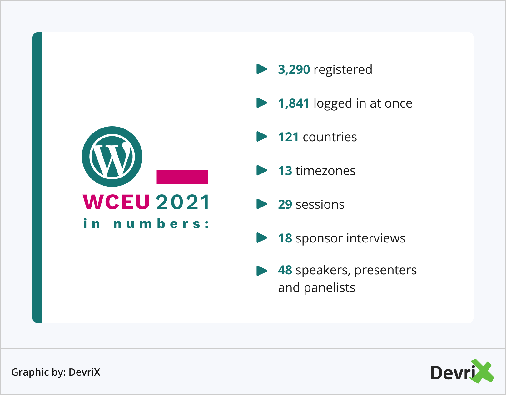 Gracias a la gran organización del evento, todos los participantes, patrocinadores y entusiastas de WordPress, WCEU 2021 ha reunido a principiantes y expertos de WordPress por igual. El programa del evento ofreció diversos formatos como charlas, entrevistas, talleres y paneles de discusión.