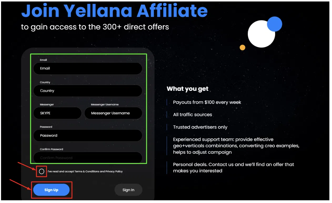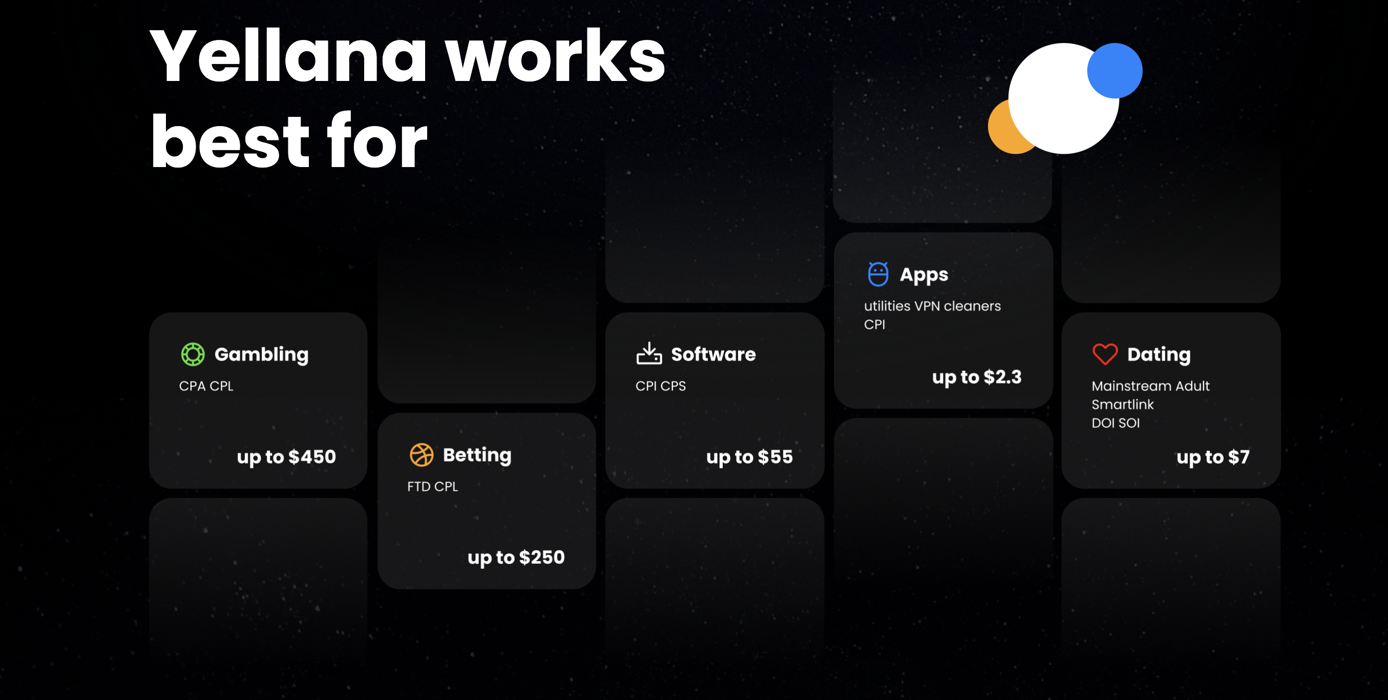 Yellana ofrece tarifas exclusivas y modelos de pago de clientes potenciales para cualquier GEO y fuente de tráfico, junto con creatividades gratuitas, paquetes de trabajo y asistencia para la configuración de campañas.