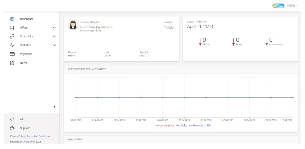 Los afiliados se benefician de pagos semanales a partir de $ 100, una amplia gama de fuentes de tráfico aceptadas (excluyendo el fraude), anunciantes confiables y verticales principales como juegos de azar, apuestas, software, aplicaciones y citas.