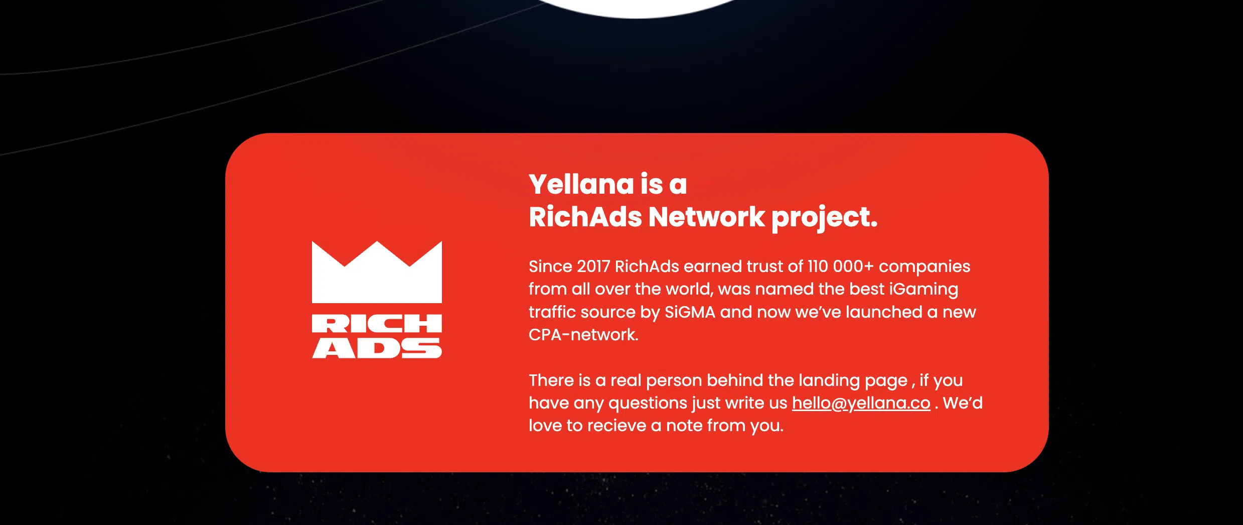 Yellana es propiedad de Holding Richads Ltd, con Anastasia Titova como directora de la red. La red se creó como parte del holding de redes publicitarias RichAds, que ha estado operando desde 2017.