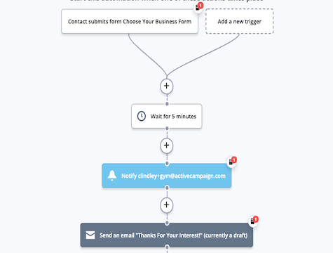 - Vérifier la progression du contact et notifier l'expéditeur : cette étape de notification est déclenchée si le contact n'a rencontré aucune des actions IF/ELSE précédentes. Ils peuvent avoir été entrés accidentellement, nécessiter un ajustement, etc. Cela permet à un membre de l'équipe de savoir afin qu'il puisse rechercher le contact.