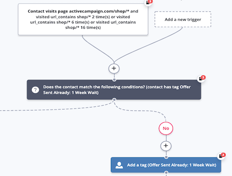 - L'automatisation vérifie la progression du contact : pour s'assurer qu'un contact ne reçoit pas la même offre à chaque visite de la page de la boutique, cette action IF/ELSE recherche une balise pour voir si le contact est récemment passé par l'automatisation. S'ils ont le tag, ils quitteront l'automatisation. Sinon, ils continueront normalement et recevront ensuite la balise.