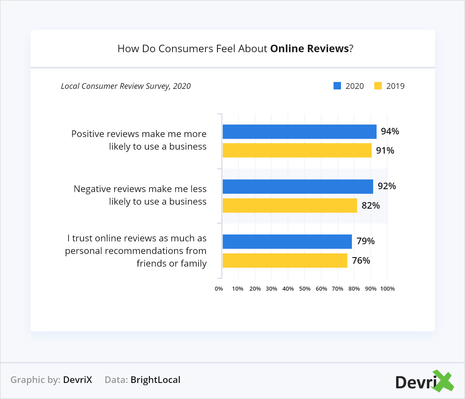 Les recherches montrent que 79 % des gens font autant confiance aux avis en ligne qu'aux recommandations personnelles de quelqu'un qu'ils connaissent. De plus, 94% des personnes sont plus susceptibles de faire affaire avec une marque qui a des critiques positives, et 92% reconsidéreront leur décision si la marque a trop de critiques négatives.