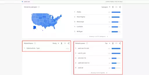 Si quelqu'un recherche "Pièces de voiture dans l'Ohio", il a déjà décidé d'acheter des pièces de voiture et essaie de le faire à un endroit spécifique. Donc, inclure cela et des expressions connexes dans votre contenu vous aidera à vous classer plus haut dans les résultats de recherche , ce que Google Trends vous aide à découvrir.