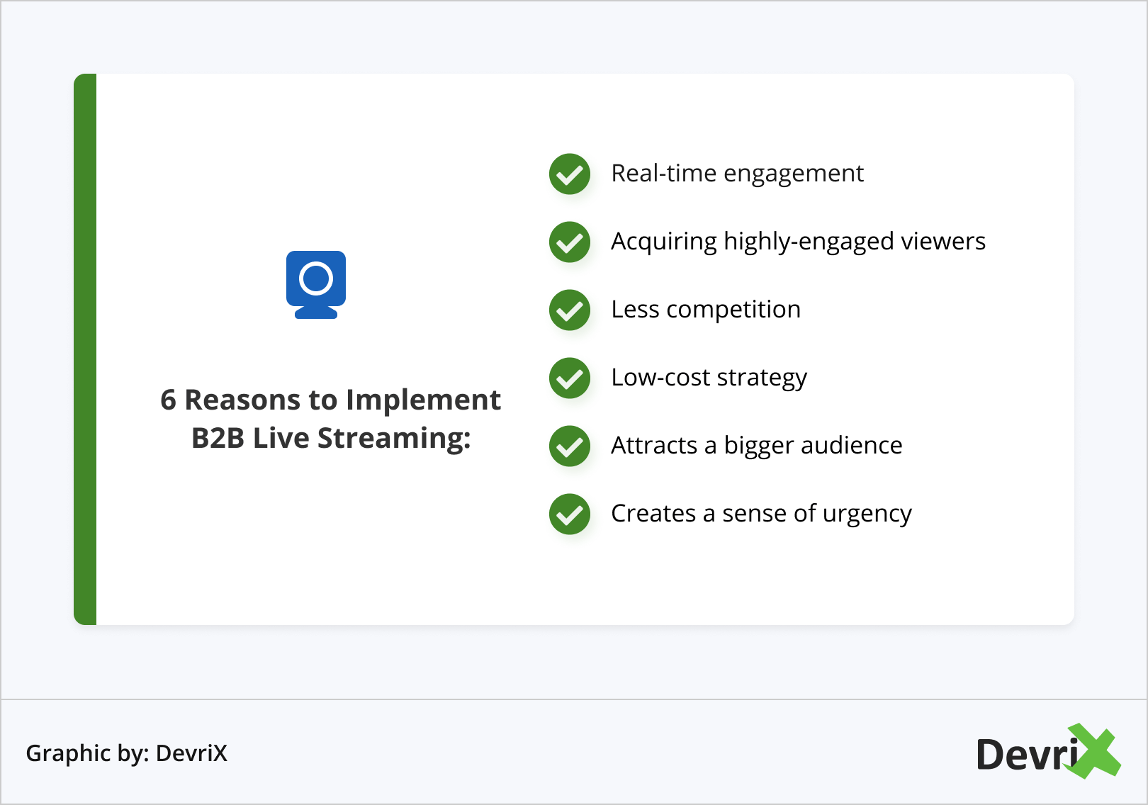 Nous avons parlé de la puissance du streaming vidéo en direct, mais vous vous demandez peut-être ce qu'il peut faire pour améliorer votre entreprise B2B. Il existe plusieurs raisons de l'essayer, notamment les suivantes :